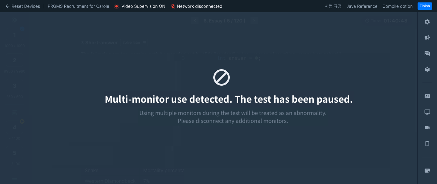 If the test is paused due to multi-monitor detection, check your PC and disconnect all extra monitor cables.