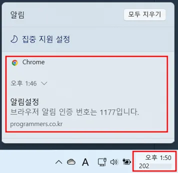 만약, 인증 번호 알림창을 확인하지 못했다면, 오른쪽 하단의 날짜 영역을 클릭해보세요. 숨겨진 알림 내용을 확인 할 수 있습니다.