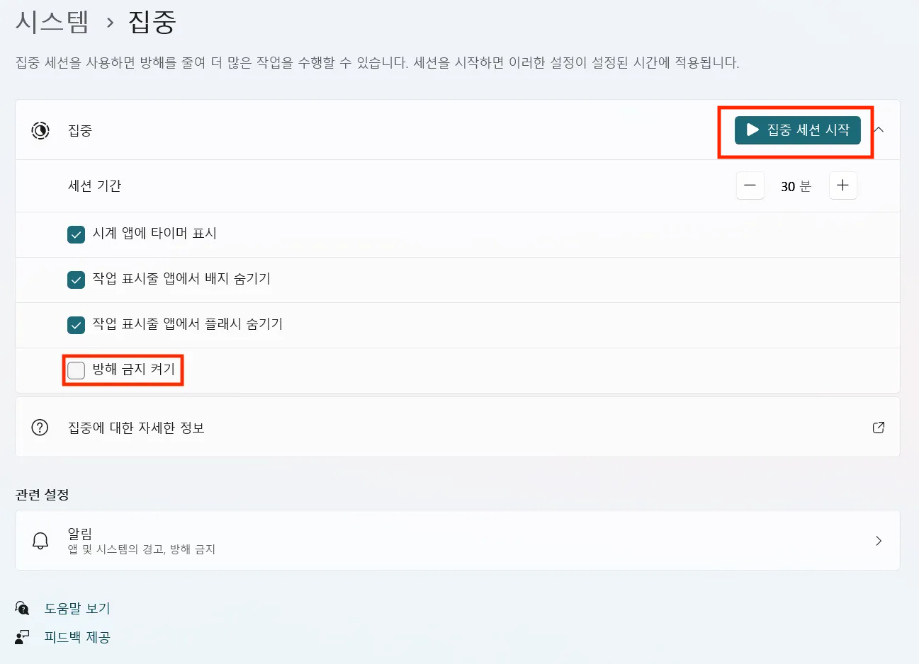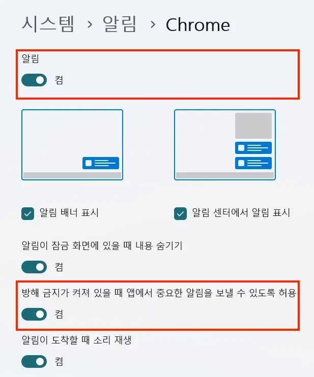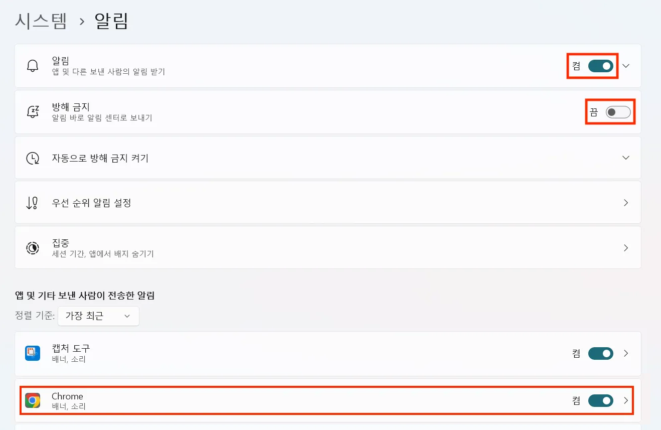 그럼에도 알림창이 보이지 않는다면 아래 내용을 참고해 집중 지원/방해금지와 알림 설정을 확인해주세요.
