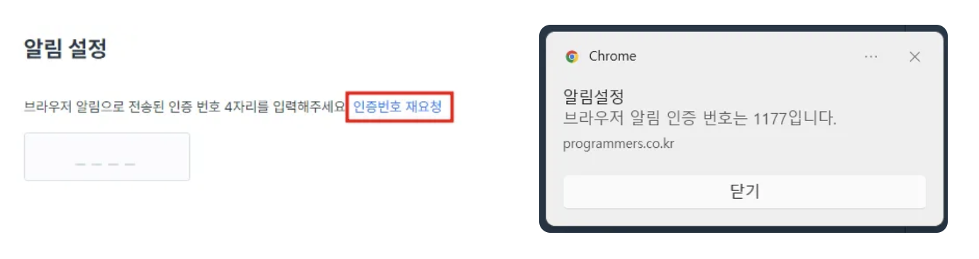 알림 설정 단계에서 컴퓨터 알림창으로 인증번호가 발송됩니다.