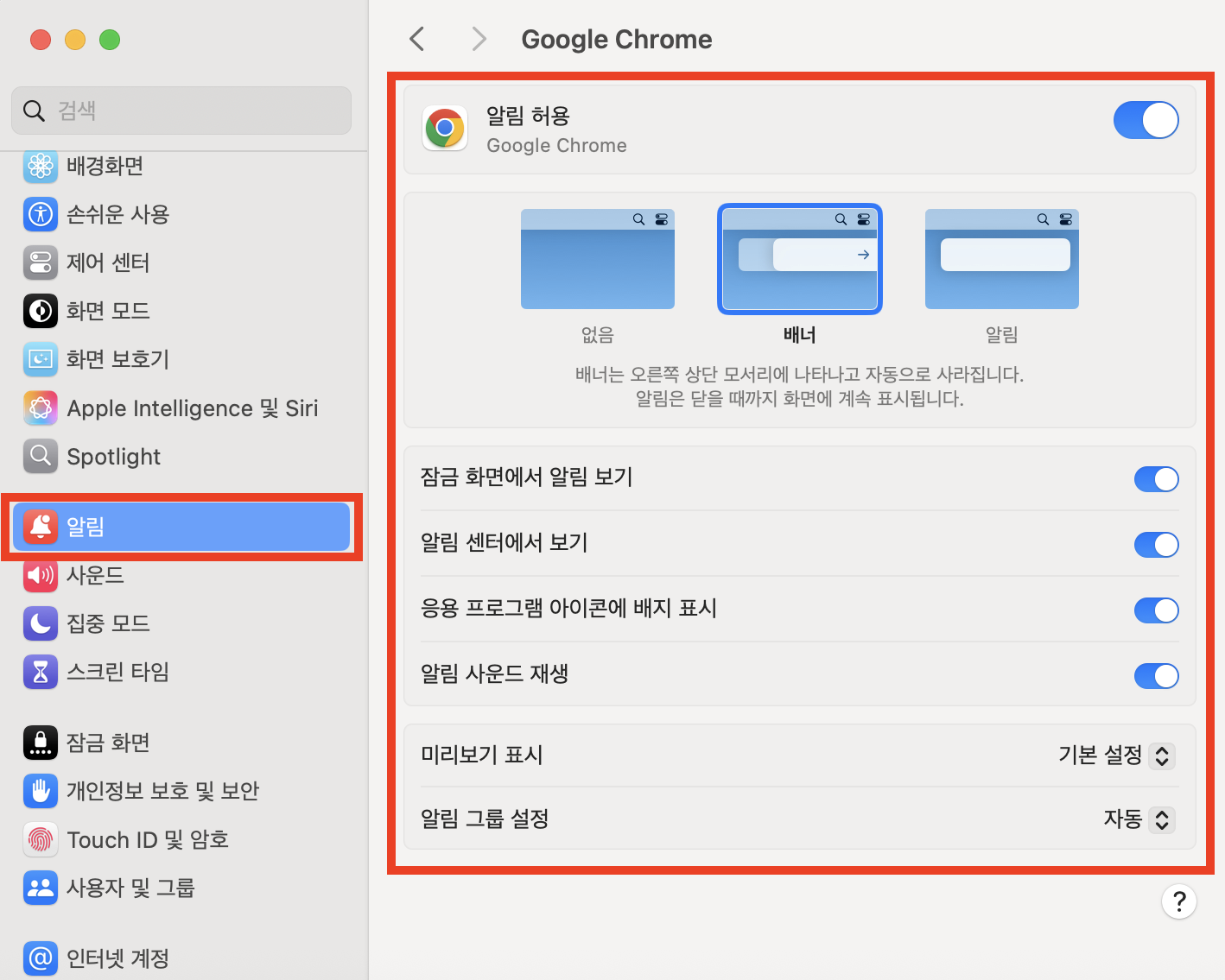 시스템 환경 설정에서 알림 센터 설정으로 이동하여 사용 중인 브라우저의 알림을 모두 허용으로 변경해 주세요.