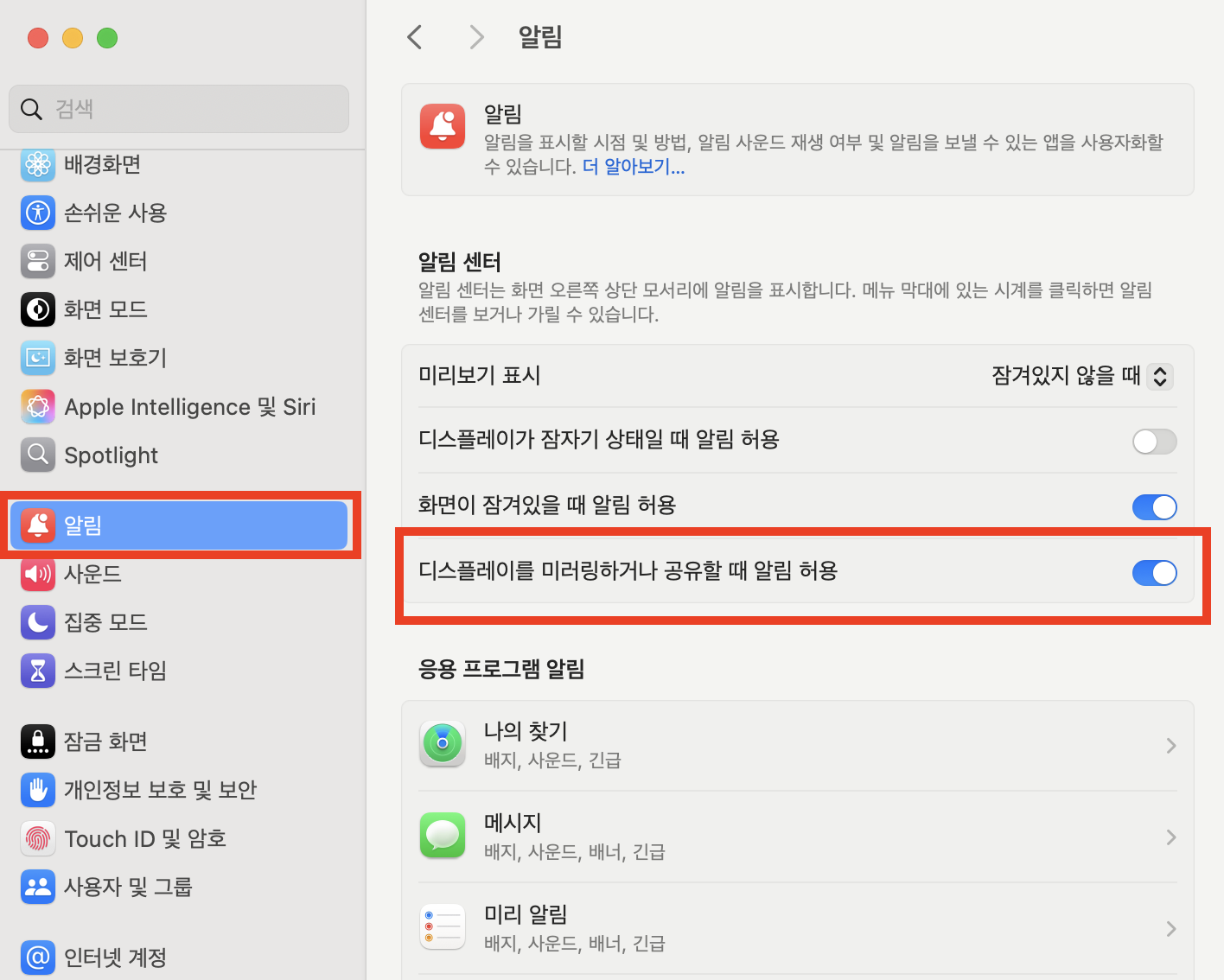시스템 환경 설정에서 알림 설정으로 이동하여 디스플레이를 미러링하거나 공유할 때 알림 허용 부분을 허용으로 변경해 주세요.