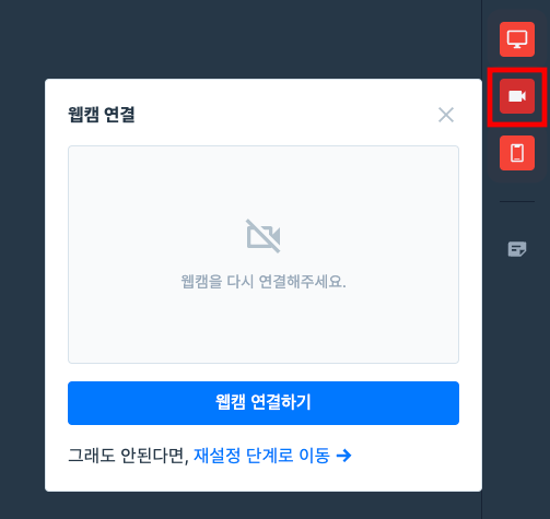 우측의 빨갛게 표시된 화상기기 메뉴를 클릭하세요. 시험 화면 내에서 다시 연결할 수 있습니다.
