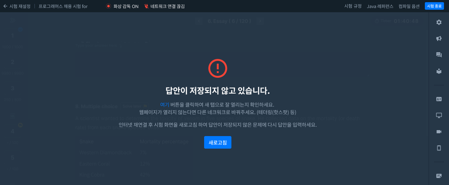 또한, 네트워크가 원활하지 않다면 답안이 저장되지 않을 수 있습니다.
