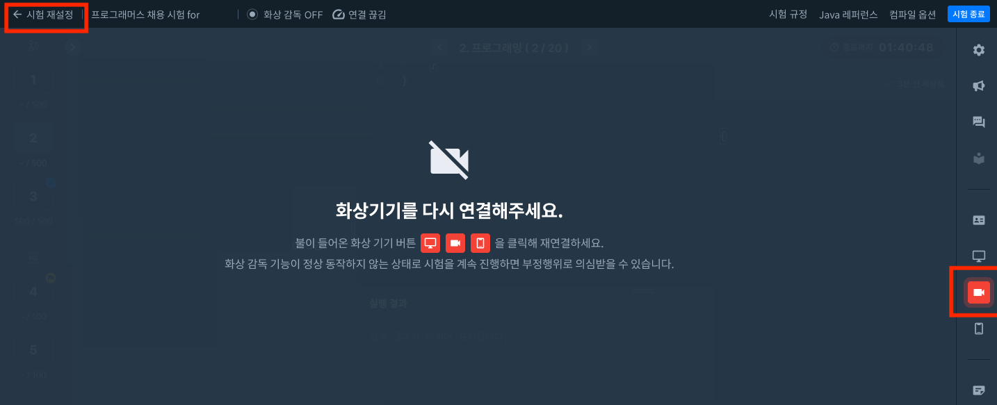 또는 좌측 상단의 시험 재설정 버튼을 클릭해 화상기기 연결 단계로 이동할 수 있습니다.