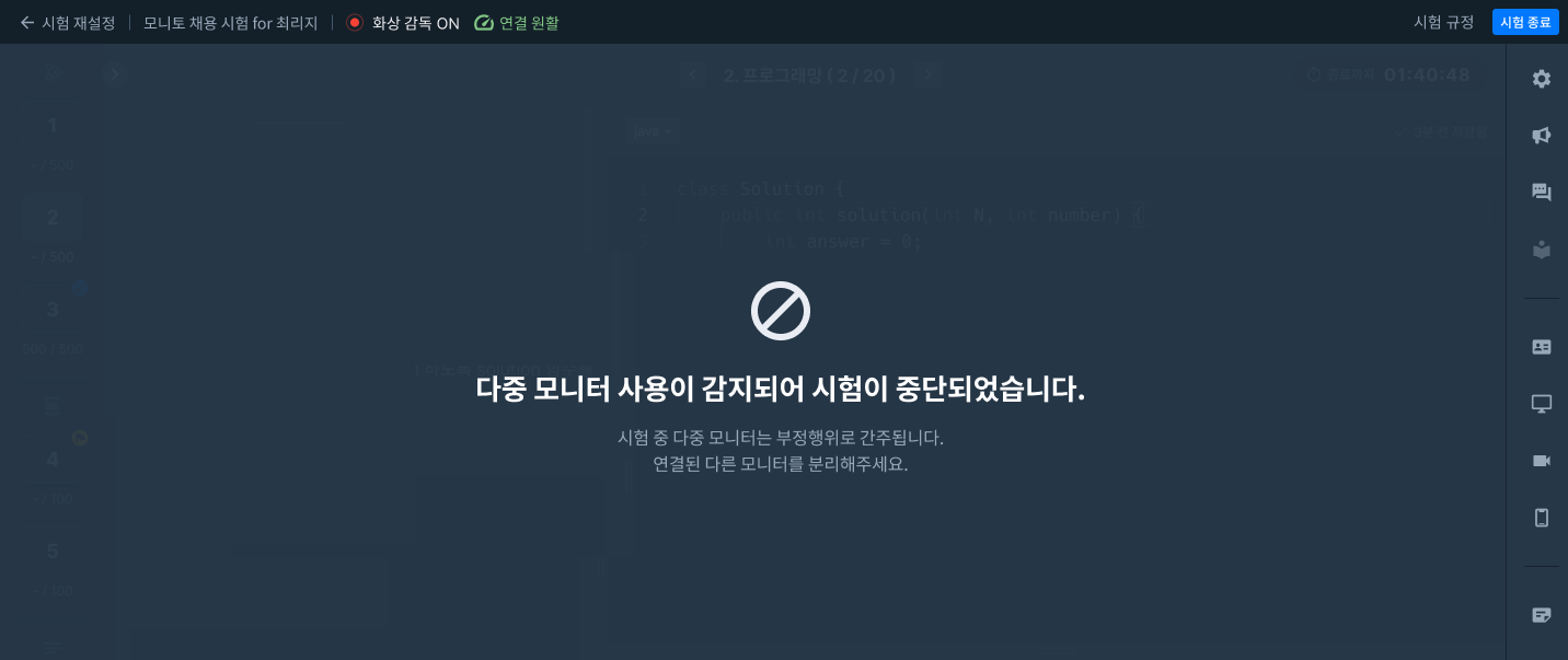 다중모니터 사용이 감지되어 시험이 중단되었습니다.