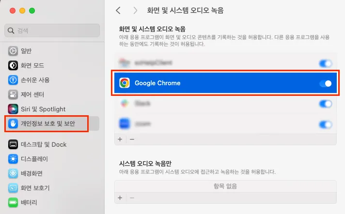 Apple 메뉴 → 시스템 설정 → 개인 정보 보호 및 보안 → [화면 및 시스템 오디오 녹음] 메뉴로 이동합니다. (혹은 화면 기록 메뉴)