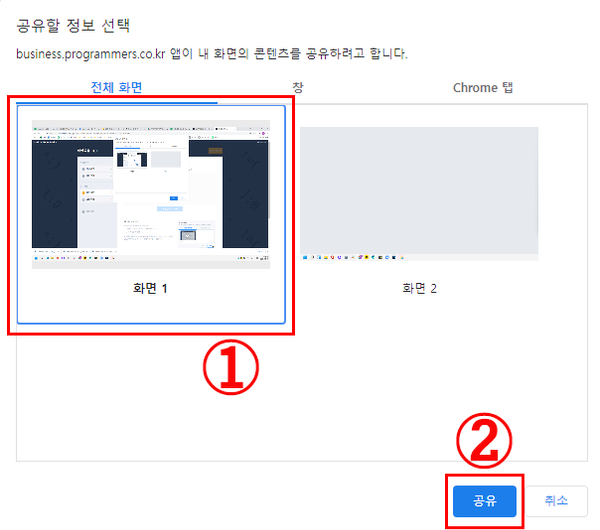 2. 이후 공유할 화면(1)을 선택하고 공유 버튼(2)을 선택합니다.