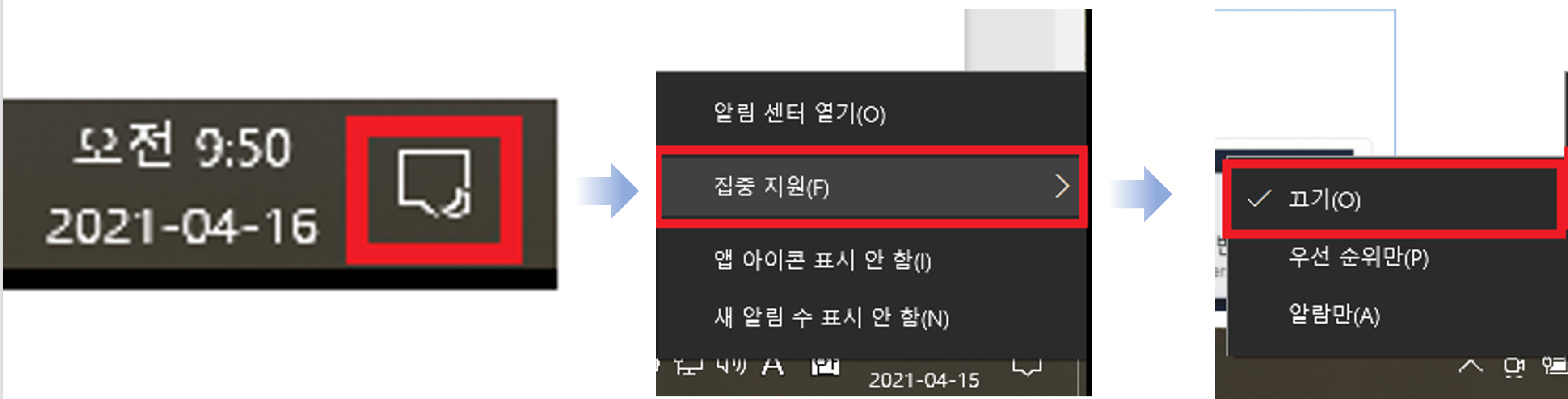 메세지 박스 모양의 아이콘 클릭 →집중 지원→끄기를 선택합니다.
