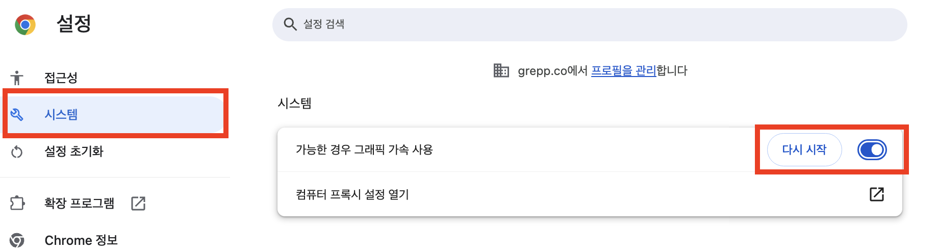 크롬 우측 상단 점 세개 메뉴에서 설정으로 이동합니다. (chrome://settings/system)
