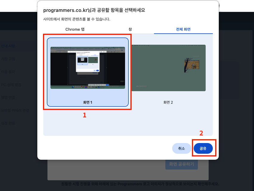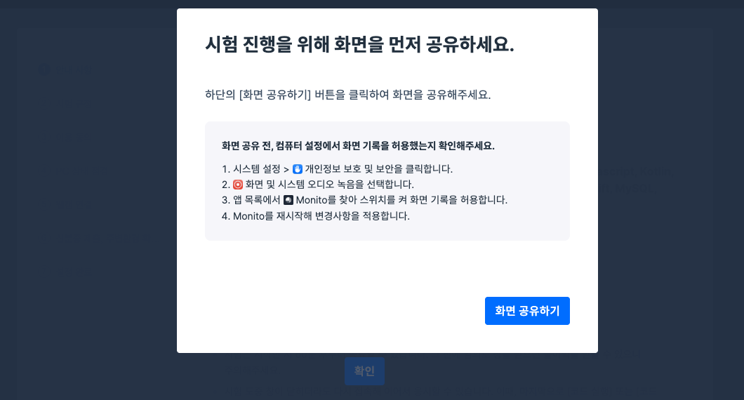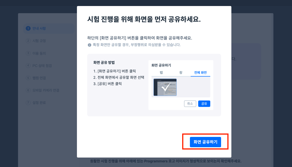 1. 시험장에 입실 후 보이는 팝업창에서 화면 공유하기를 클릭합니다.